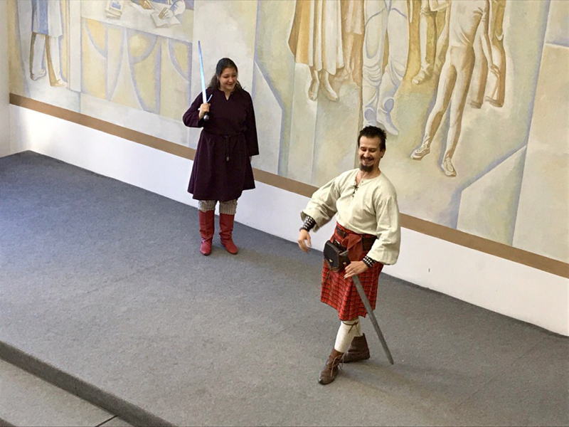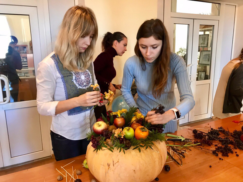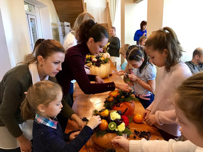 Интересно и увлекательно была выстроена развлекательная программа: анимационные игры, конкурсы, шоу мыльных пузырей. Эмоционально отреагировала детвора на выступление клуба артистического фехтования «Вольные бойцы». С большим увлечением дети и взрослые приняли участие в мастер-классе по созданию красивых осенних композиций из тыквы, фруктов, осенних цветов, которые они с благодарностью подарили Н.Н. Гришиной.
