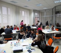 Особый успех имела активная смена видов деятельности в процессе работы: участники работали в парах и мини-группах, обсуждали педагогические и методические вопросы в формате пресс-конференции и брифинга, просматривали видео с новым лексическим материалом, обучали друг друга и делились опытом, читали и обсуждали тексты по принципу информационного пробела и писали нон-стоп диктант.