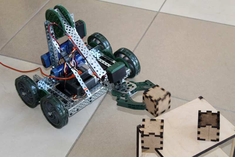 На площадке с манипулятором VEX, позволяющим автоматизировать сортировку деталей, дети пробовали с помощью пульта управления собрать элементы манипуляции и переставить их на другое место.