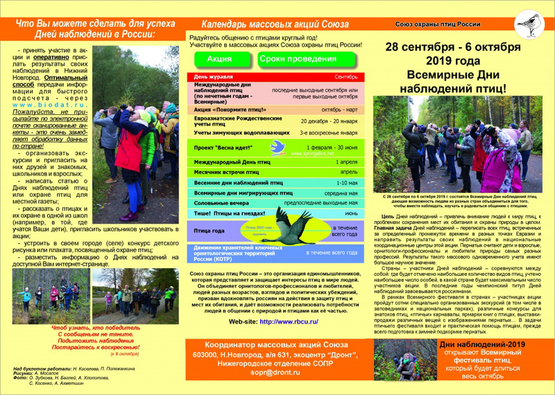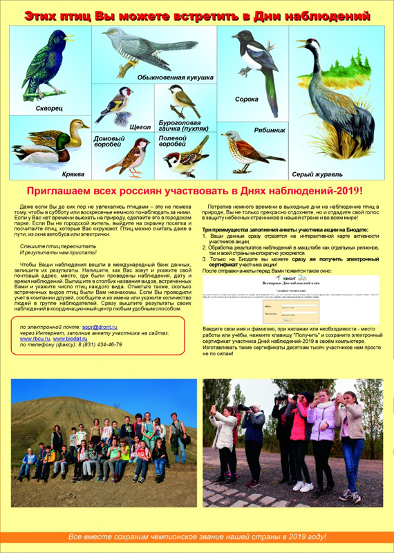 Встреча была посвящена осенней акции «Всемирные Дни наблюдения птиц», которая проводится ежегодно с целью привлечения внимания людей к миру птиц, к проблемам сохранения мест их обитания. По решению Союза охраны птиц России, в этом году учет пернатых странников на просторах нашей необъятной родины можно будет вести целую неделю (с 28 сентября по 6 октября), вместо обычных двух дней. Принять участие в переписи птичьего населения сможет любой желающий, достаточно будет посчитать всех встреченных за единицу времени в определенном месте птиц и заполнить анкету на www.biodat.ru.