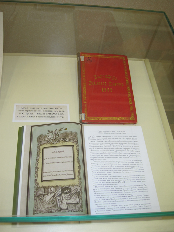 На выставке можно было увидеть «Памятные книжки губерний и областей Российской империи», где дана подробная историческая справка о Рязанской губернии с указателями имен, статей и публикаций исторических документов, иллюстраций и картой губернии; путеводители краеведа-исследователя Н.Н. Аграмакова. Особого внимания заслуживал «Атлас Рязанского наместничества с топографическим описанием», сочиненный губернским землемером майором Тулаевым и датируемый 1794 годом. На выставке демонстрировалось факсимиле 2015 года. Большой интерес многочисленных посетителей, среди которых были министр культуры и туризма Рязанской области В.Ю. Попов, митрополит Рязанский и Михайловский Марк, вызвали редкие издания РОУНБ.