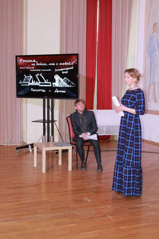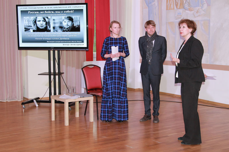 29 мая при поддержке культурно-просветительского общества «Радуга» в библиотеке состоялся литературный вечер «Россия, не бойся, мы с тобой». Гости из Санкт-Петербурга – актриса Большого драматического театра им. Товстоногова Александра Куликова и актёр Театра на Фонтанке Борис Драгилёв – представили на суд зрителей потрясающий по силе эмоционального воздействия поэтический мини-спектакль.