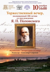 После церемонии награждения участников юбилейного события пригласили в музыкально-литературную гостиную. Благодаря поэзии Я.П. Полонского и романсам, написанным на его стихи, зрители окунулись в атмосферу XIX века. Перенестись в золотой век нашей литературы помогли артисты Рязанского областного музыкального театра и Рязанской областной филармонии, мастер сцены областного театра драмы Валерий Рыжков и балетная студия муниципального культурного центра под руководством Ольги Шульги.
