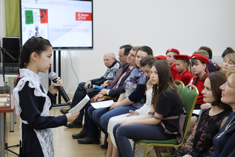 На мероприятии выступила победитель конкурса сочинений, организованного библиотекой имени Горького в 2018 году, ученица 7-го класса школы-интерната имени Героя Советского Союза, Национального героя Италии Ф.А. Полетаева Надежда Заборова. Она зачитала отрывок из собственного сочинения о герое. На презентации были исполнены стихи «Федор Полетаев» Бориса Жаворонкова и «Федор» итальянского поэта Бини. Украшением встречи стали музыкальные номера студентки РГУ имени С.А. Есенина Златы Журавлевой. К мероприятию был подготовлен выставочный проект «Русский солдат Федор Полетаев».
