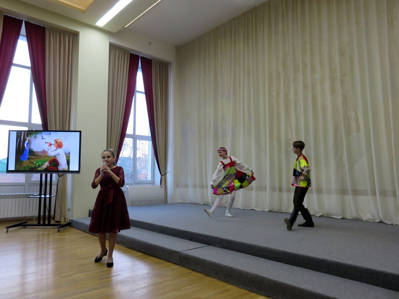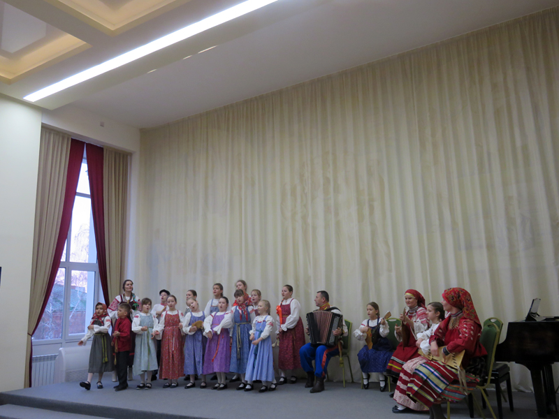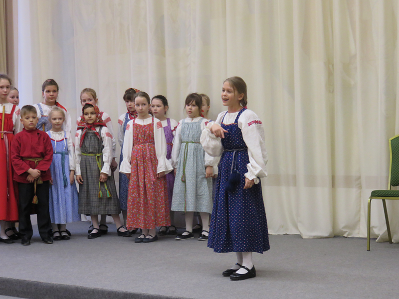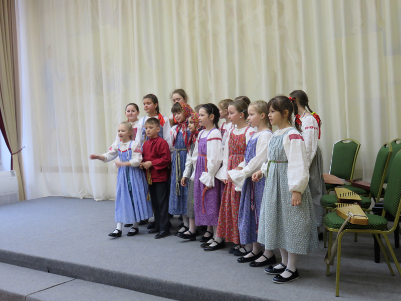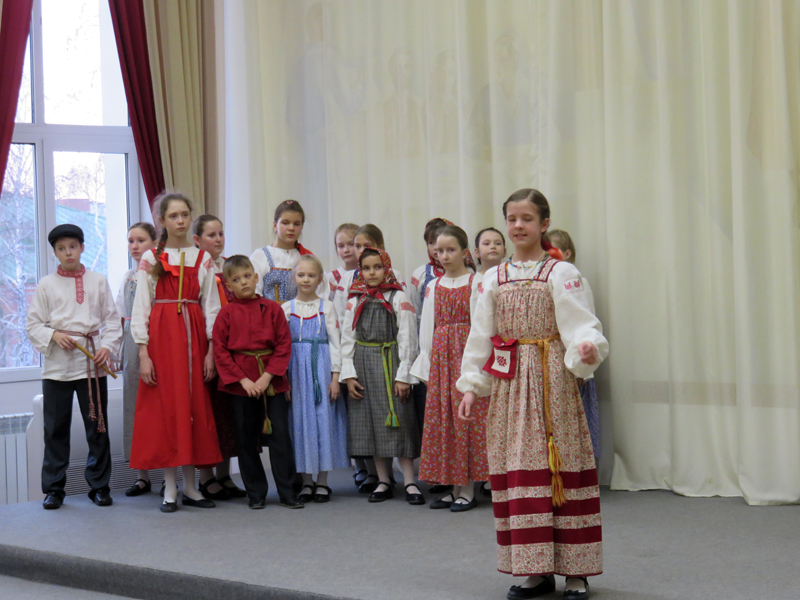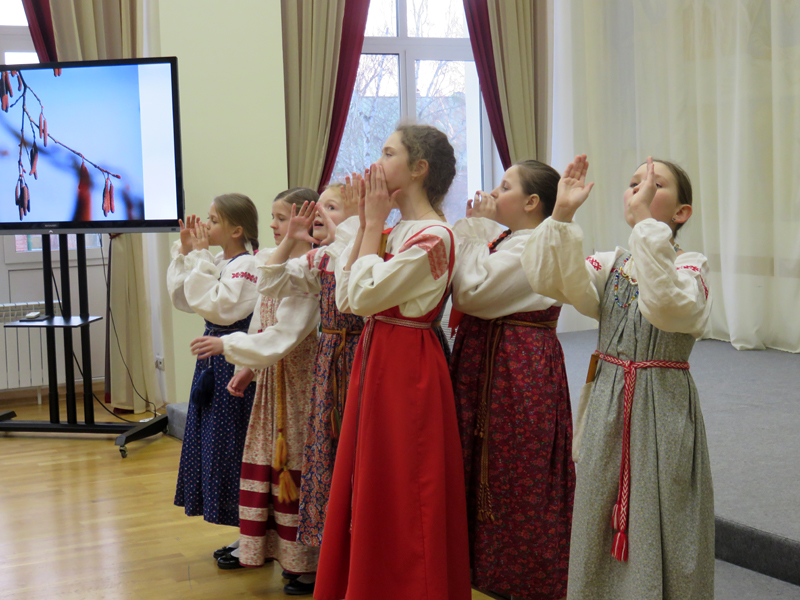 Необычайно красиво выступил фольклорный ансамбль, представивший развернутую картину народной жизни с ее многовековыми традициями, календарными весенними обрядами, замечательными образцами народных песен различных областей России. Были исполнены заклички Смоленской области «Агу весна, агу красна», «Ай, весна-красна - тепло летечко», весенняя песня Тверской области «На Ягорье по утру» (Мария Китова), свадебная песня «Пошла наша Дуня» (Маргарита Хромова), сказка «Кот-котофей» (София Горяинова), скоморошина Новосибирской области «А и где же было видывано».