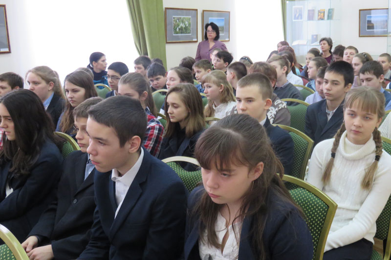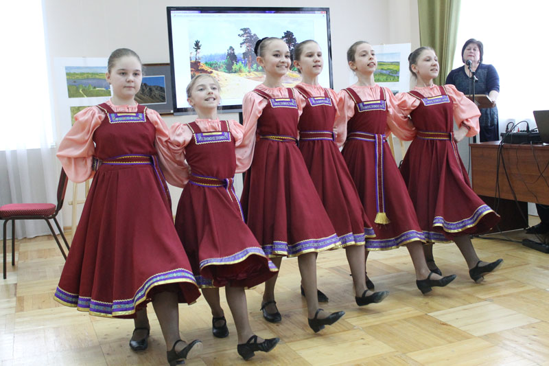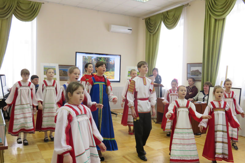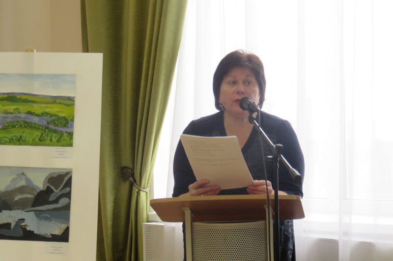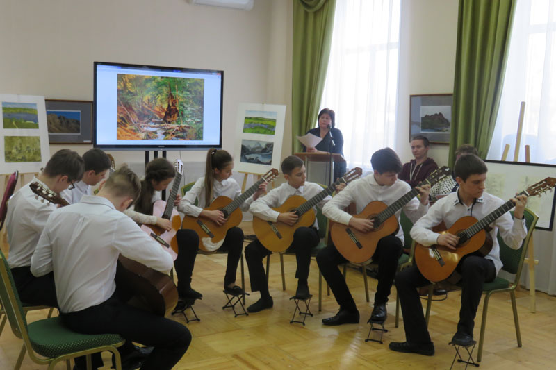 Малый конференц-зал библиотеки был украшен пейзажными работами учеников ДШИ. Экспозиция органично дополнила рассказ о творческой биографии художника.