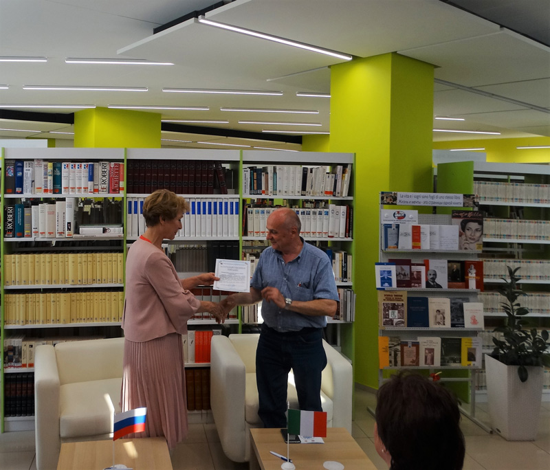 Наша библиотека, понимая ценность международного книжного обмена и межкультурного взаимодействия, передала в дар книги на русском языке для итальянских читателей. Господину Бернарди были вручены благодарственные письма библиотеки им. Горького, адресованные мэру города Ченто, а также авторам, безвозмездно передавшим свои книги библиотеке, – Итало Поцци и Эдгардо Бертулли.