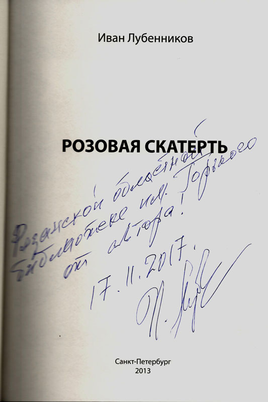 В конце встречи Иван Леонидович Лубенков подарил Рязанской областной библиотеке книгу рассказов «Розовая скатерть» с дарственной надписью.