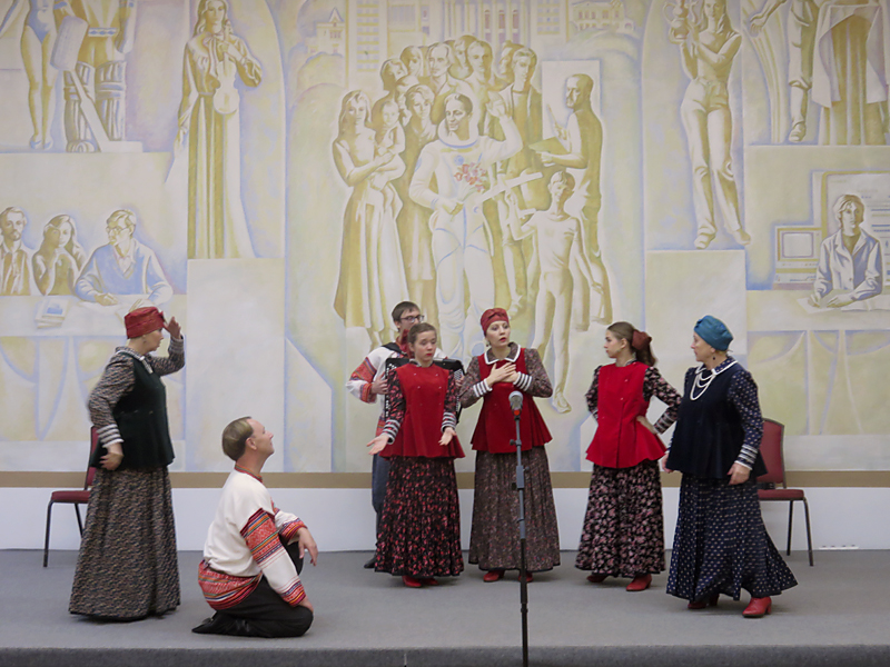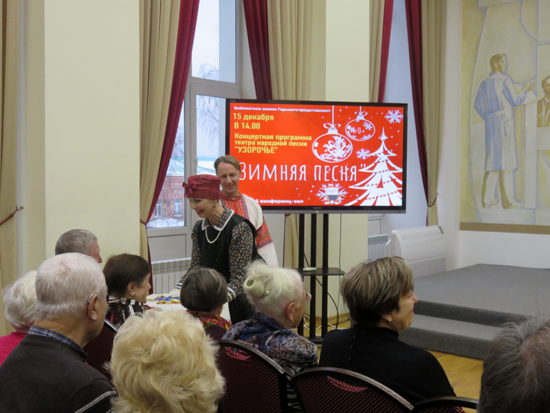 Новогодняя столица России радушно встречает гостей, знакомит с богатой историей и культурой нашего края, его талантами. Библиотека им. Горького в рамках специального проекта «Новогодняя канитель» предлагает публике множество интересных мероприятий праздничной тематики. В этом ряду – концерт «Зимняя песня», с которым выступил театр народной песни «Узорочье» МКЦ г. Рязани (художественный руководитель – Надежда Кольцова).