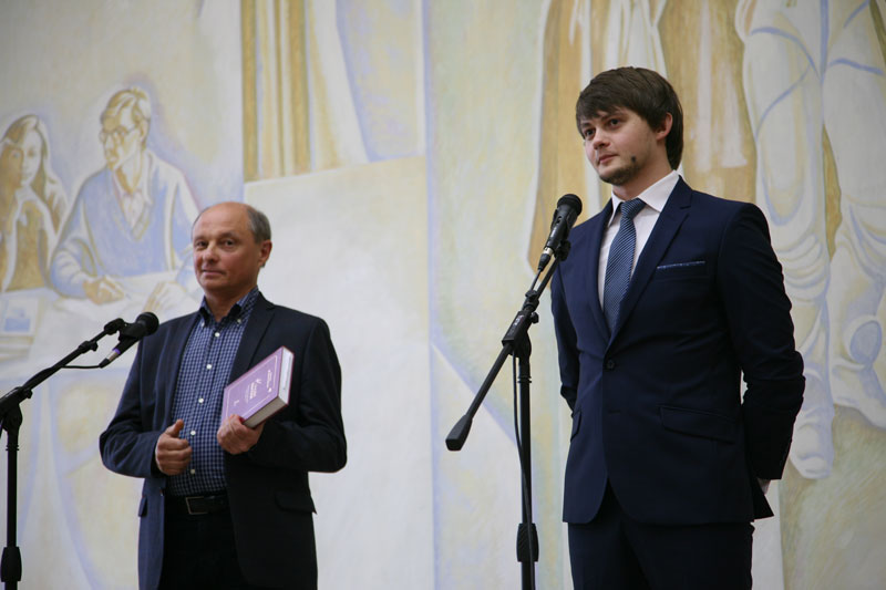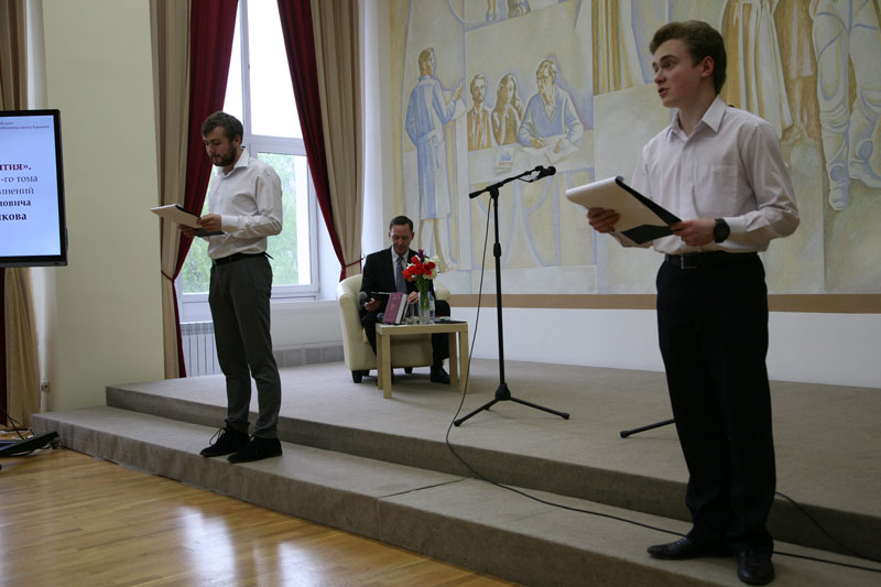 Произведения Б.И. Жаворонкова читал член Союза писателей России, ведущий презентации Константин Паскаль, артисты студенческого театра «Переход» Даниил Алексеев и Василий Макаров.