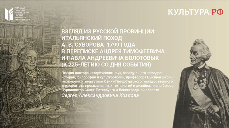 Темой сегодняшней встречи стал итальянский поход А.В. Суворова 1799 года и его отражение в переписке тульского помещика, писателя и ученого Андрея Тимофеевича Болотова (1738–1833) с сыном Павлом (1771–1850).