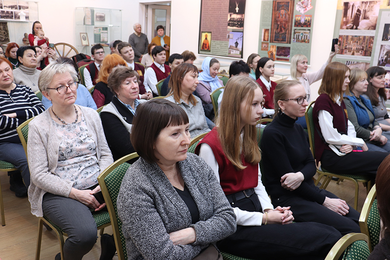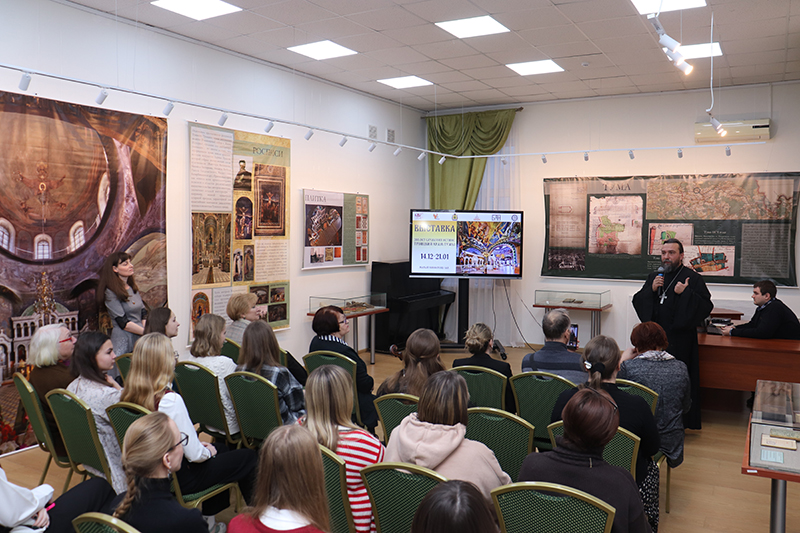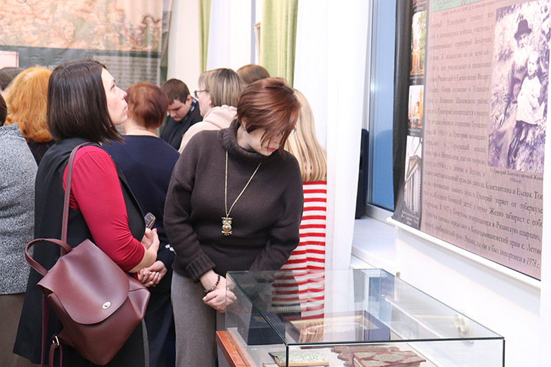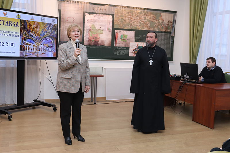 Ведущие – главный библиограф краеведческого отдела, инициатор выставки Оксана Владимировна Смирнова и настоятель храма во имя Пресвятой Троицы поселка Тума Клепиковского района иерей Михаил Митрохин –поприветствовали присутствующих: историков, педагогов, краеведов, учащихся школы № 47 г. Рязани, сотрудников библиотеки. Отец Михаил выразил благодарность директору библиотеки за возможность организовать в стенах библиотеки выставку. Здесь же хотим отметить, что научным руководителем и дизайнером данного проекта стала историк Анастасия Викторовна Фетисова, она пожелала участникам «вдоволь насладиться результатами трудов» создателей выставки.