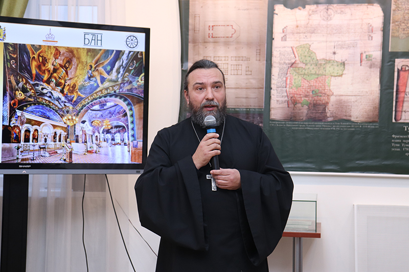 Обзор экспозиции «200 лет служения Истине. Троицкий храм Тумы» провел настоятель храма иерей Михаил Митрохин. Он рассказал гостям об основных вехах истории бывшего Тумского уезда, познакомил их с людьми, чьи жизни были тесно связаны с тумским приходом, показал прекрасный интерьер храма, столь неожиданный в мещерских лесах за 100 километров от Рязани.