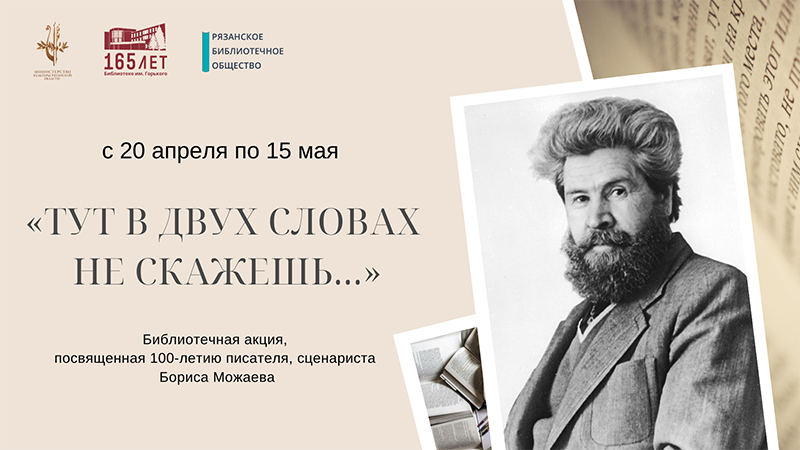 Рязанская областная библиотека имени Горького при поддержке Министерства культуры Рязанской области и Рязанского библиотечного общества проводит акцию «Тут в двух словах не скажешь…», приуроченную к празднованию 100-летия со дня рождения советского и российского писателя и сценариста Бориса Андреевича Можаева.
