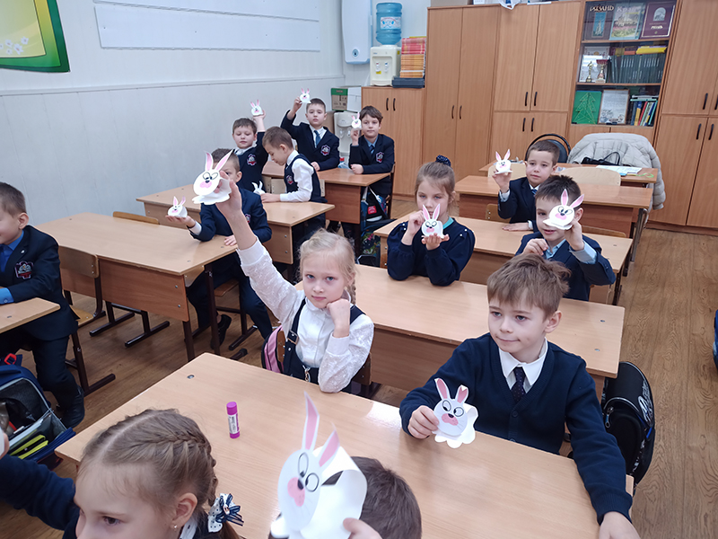 В ходе мероприятия библиотекари прочитали школьникам сказку «Козявочка», ребята посмотрели отрывок из мультфильма «Про храброго зайца, косые глаза, длинные уши и короткий хвост». Дети смастерили своими руками фигурку зайчика из бумаги, которую можно повесить на новогоднюю елку или подарить родным и близким.