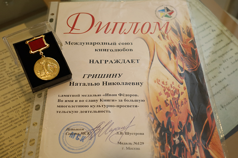 Заслуженный работник культуры РФ, Президент Международного союза книголюбов, директор Музея экслибриса и миниатюрной книги Людмила Владимировна Шустрова подробно рассказала о Международном конкурсе экслибрисов, о юбилее Международного союза общественных организаций книголюбов. Людмила Владимировна вручила Наталье Николаевне Гришиной памятную медаль «Иван Федоров. Во имя и во славу Книги» за большую подвижническую работу по продвижению книги и чтения. В фонд библиотеки был передан каталог выставки и «Альманах библиофила».