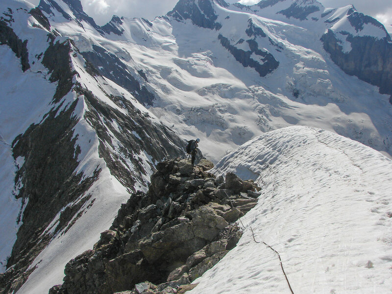 Далеко на западе виднеются суровый Эрцог и всегда заснеженный Джаловчат. Строй стены продолжают Алибек-Баши и Чхалта-Дзых и, наконец, одна из самых выразительных вершин Домбая – пирамидальная Белалакая – 3 851 метр. За ней следует покрытая снегами вершина Софруджу с черным изогнутым скальным Зубом, как бы вонзающимся в небесную синь. Далее возвышаются прикрытые шапкой клубящихся облаков стены и башни Аманауза, откуда нередко с грохотом срываются камни.