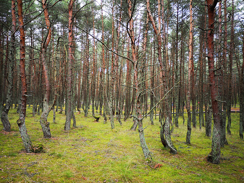 «Танцующий лес» на Куршской косе – уникальное природное явление. Изгибаясь в различных направлениях и закручиваясь кольцами, деревья принимают самую причудливую форму. Говорят, животные обходят этот лес стороной, но туристы любят посещать это странное и жутковатое место.