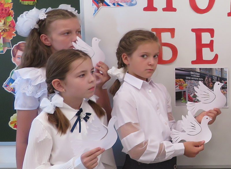 В рамках урока был показан тематический видеоролик, проведена беседа, направленная на развитие у детей духа патриотизма. Каждый ребенок к уроку изготовил из белой бумаги голубя мира в память о погибших детях.