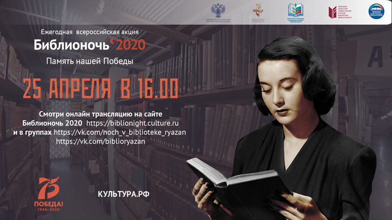 – в период с 25 апреля (после 17.00) по 9 мая выложить видеоролик в любую социальную сеть с хэштегами #75словПобеды и #Библионочь2020;