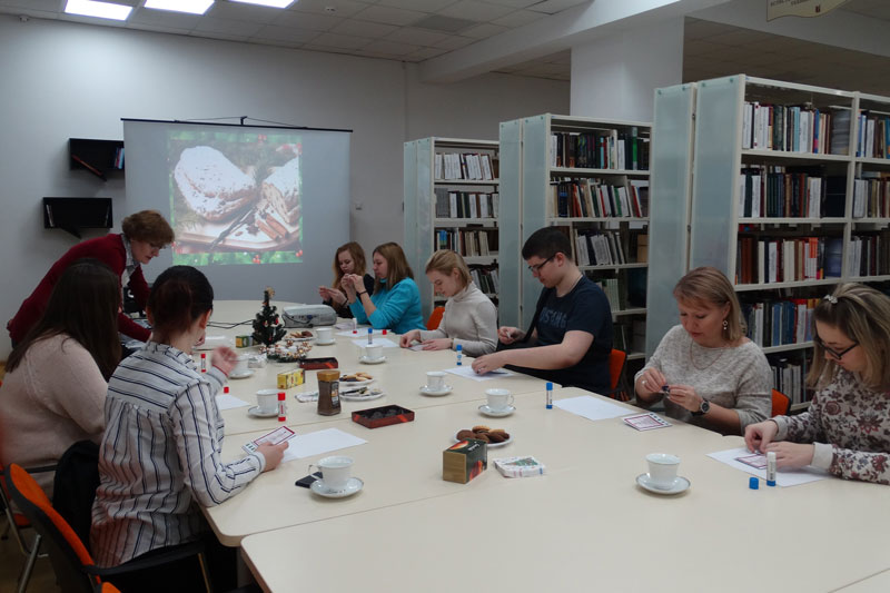 Сотрудники библиотеки представили презентацию, посвященную рождественским традициям в Германии, читатели увидели яркие видеоролики и услышали широко известные рождественские песни на немецком языке. Гости с воодушевлением приняли участие в мастер-классе по изготовлению открытки с красочной рождественской символикой. Мероприятие закончилось чаепитием, которое добавило задушевности предпраздничной встрече.