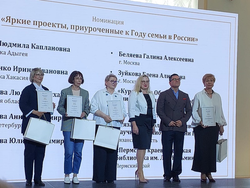 В номинации «Яркие проекты, приуроченные к Году семьи в России» библиотека имени Горького отмечена грамотой Министерства культуры Российской Федерации за организацию и реализацию масштабных и успешных проектов, направленных на продвижение семейных ценностей и традиций. Награду директору библиотеки вручили заместитель директора департамента региональной политики, образования и проектного управления Министерства культуры Российской Федерации Жанна Владимировна Алексеева и Президент Российской библиотечной ассоциации, генеральный директор Российской государственной библиотеки Вадим Валерьевич Дуда.