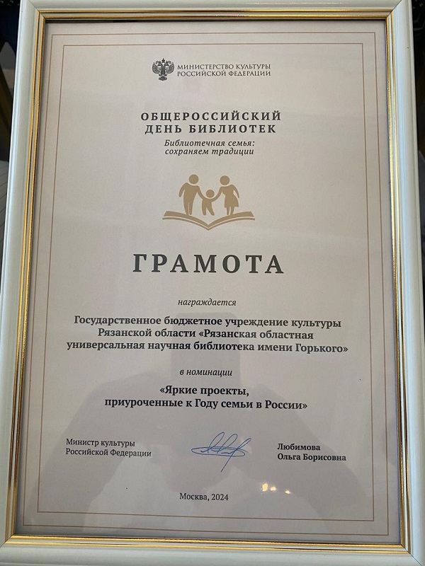 Библиотека имени Горького отмечена наградой Министерства культуры Российской Федерации в номинации «Яркие проекты, приуроченные к Году семьи в России»
