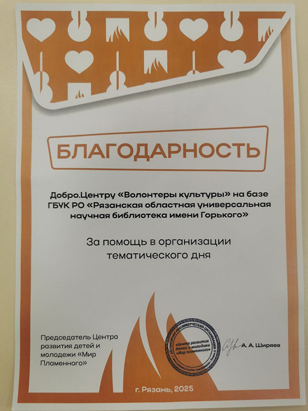 9 августа сотрудники Рязанской областной универсальной научной библиотеки имени Горького приняли участие в тематическом дне «Смена первых: Пламенный — 50!», который состоялся в Центре активной молодёжи и детей «Лучезарный». Мероприятие было посвящено 50-летнему юбилею лагеря «Пламенный» и направлено на популяризацию русского языка и литературы среди подрастающего поколения.