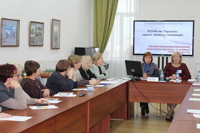 Н.Н. Гришина, директор РОУНБ им. Горького, и О.А. Калинина, директор Тульской библиотечной системы, поделились примерами разностороннего опыта деятельности библиотек. Заместитель директора библиотеки им. Горького Н.Н. Чернова рассказала о только что закончившемся Межрегиональном фестивале национальной книги «Читающий мир» и его роли в организации социокультурного пространства региона. С.А. Винокурова, заместитель директора по развитию библиотеки им. Горького, осветила задачи, стоящие перед учреждением, и заострила внимание на образовательной деятельности. Коллеги из Тульской библиотечной системы Н.М. Артемова и Т.Н. Калабина представили свой опыт работы по краеведению и программу повышения квалификации сотрудников.