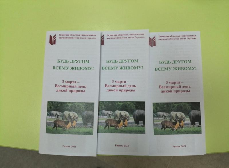 Сотрудники кафедры периодических изданий к этой дате подготовили лифлеты с информацией о празднике и перечислением правил поведения на природе. В рамках сотрудничества со школой №68 в 3 «Б» классе прошел час информации о Всемирном дне дикой природы. В конце занятия ребята повторили правила охраны природы и изготовили книжную закладку.