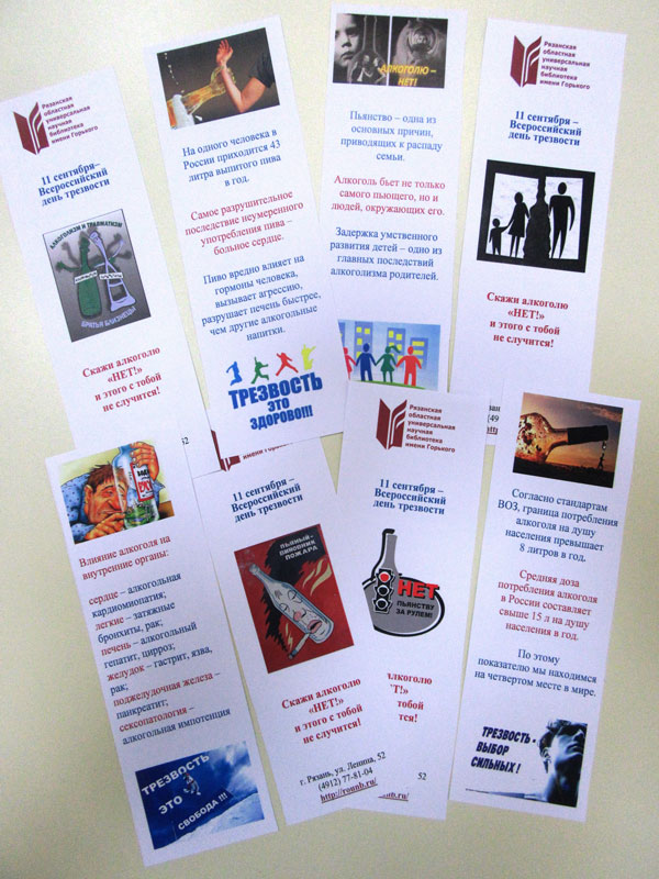 В целях профилактики алкоголизма и пропаганды здорового образа жизни в зале периодических изданий работает выставка «Алкоголизм: проблема социальная, экономическая и экологическая», а в фойе библиотеки демонстрируется видеоролик «Скажем алкоголю НЕТ!».