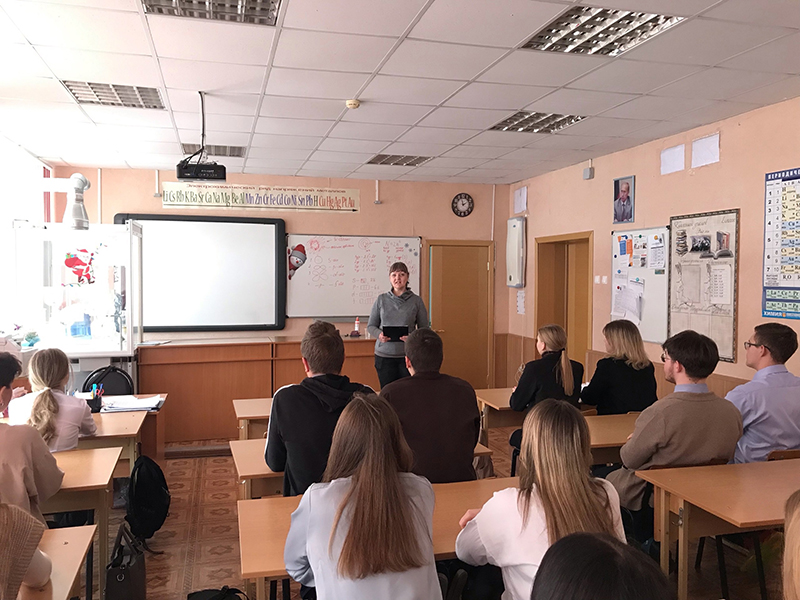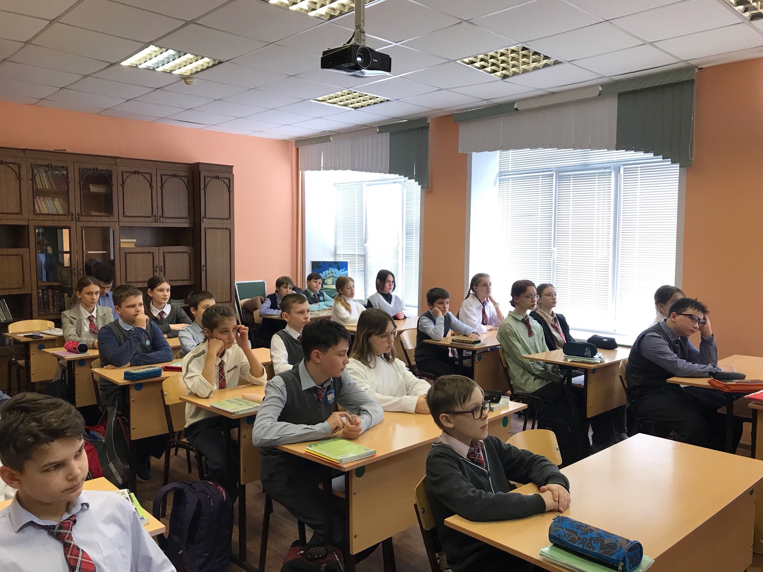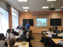 Девятиклассники познакомились с биографией Д.И. Менделеева и узнали, что он великолепно разбирался во многих науках. Ребята услышали рассказ о его величайшем научном открытии – Периодической системе химических элементов, об исследованиях ученого в области астрономии и воздухоплавания, о работах над технологией переработки нефти, изобретении бездымного пороха, об увлечении Дмитрия Ивановича изготовлением чемоданов. Дети увидели фрагменты документальных фильмов о жизни ученого.