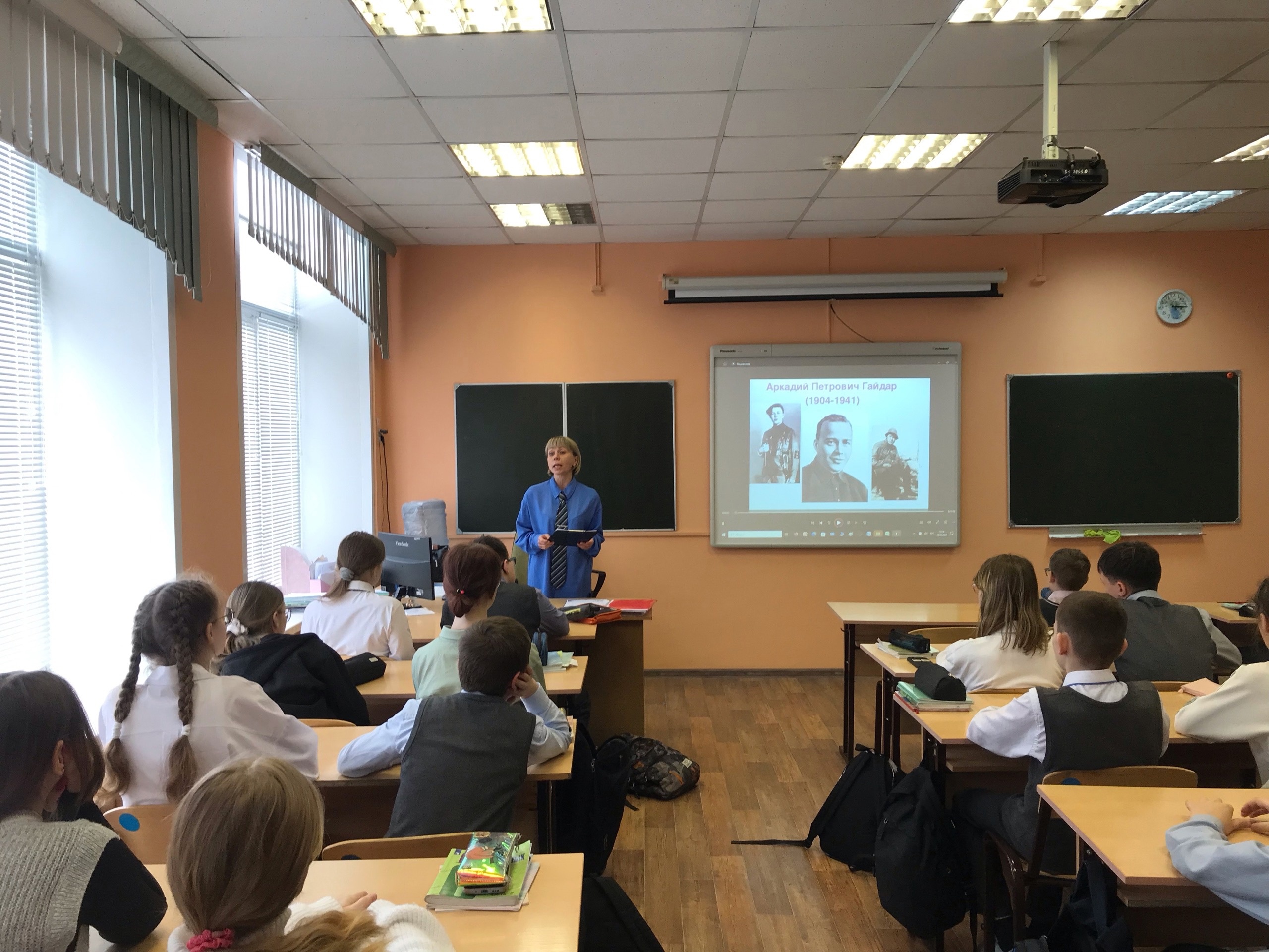 Учащиеся шестого класса узнали о военной карьере А.П. Гайдара, о том, что в 14 лет он ушел в армию, а в 16 лет уже командовал полком. Библиотекари рассказали, почему Аркадий Петрович начал писать книги для детей. Школьники посмотрели фрагменты документальных и художественных фильмов по произведениям писателя, ответили на вопросы викторины. А в конце мероприятия приняли участие в акции «Письмо солдату», написав письма нашим военнослужащим, которые сейчас находятся в зоне СВО.