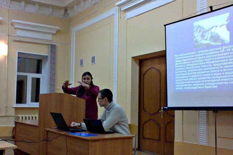 Первой в цикле стала лекция доктора филологических наук, ведущего научного сотрудника института мировой литературы РАН Анастасии Георгиевны Гачевой. Она блестяще провела параллели между философией и жизнью двух наших знаменитых земляков – Николая Федорова и Константина Циолковского. Ведь именно Федоров стал для Циолковского учителем и другом, заменил ему университетских профессоров. Даже в судьбах этих людей много сходного: события, места работы, образ жизни.