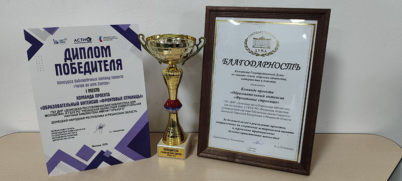 Проект «Фронтовые страницы», разработанный совместно Рязанской областной универсальной научной библиотекой имени М. Горького, Луганской молодёжной библиотекой и Донецкой республиканской библиотекой для молодёжи, занял I место.
