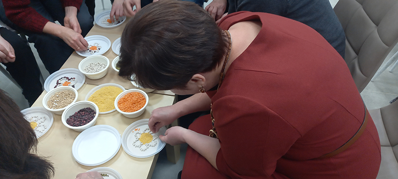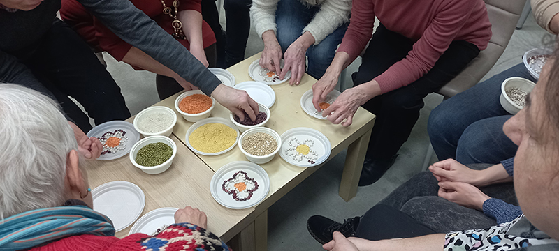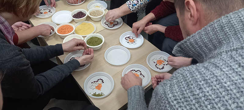 Татьяна Симакова рассказала, что такое счастье с точки зрения психологии, как повысить ощущение счастья, и предложила участникам встречи нарисовать картину радости, используя семечки тыквы и подсолнуха, бобы и чечевицу.