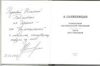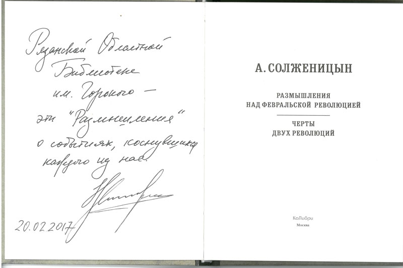 Книгу А. И. Солженицына «Размышления над Февральской революцией. Черты двух революций» Наталья Дмитриевна Солженицына передала в дар Библиотеке им. Горького на мероприятии в Доме русского зарубежья, оставив на память автограф. Издание было представлено на выставке «Мятежные дни февраля»: к 100-летию Февральской революции в экспозиционном зале библиотеки.