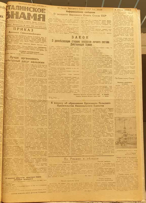 24 июня 1945 года в Москве на Красной площади состоялся парад в ознаменование победы Советского Союза над фашистской Германией в Великой Отечественной войне. Это величайшее событие отразили страницы рязанской областной газеты «Сталинское знамя».