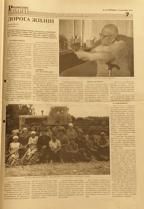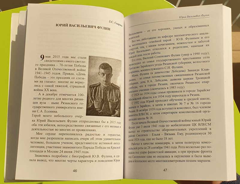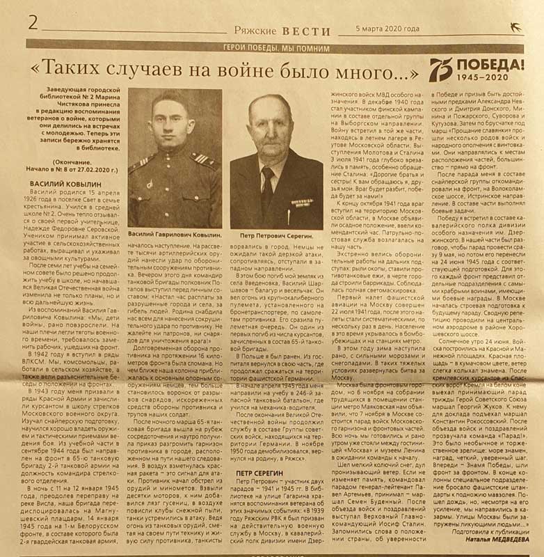 Так, рассказ о Юрии Васильевиче Фулине (1924 – 2002), преподававшем в 1944 году в Рязанском артиллерийском училище, впоследствии доценте РГУ, кандидате исторических наук, напечатан в издании РГУ имени С.А. Есенина в 2015 году. В районных газетах «Ряжские вести» (2020) и «Рязанские зори (Соколовка)» (2010) опубликована информация о бывшем политруке, участнике парадов на Красной площади в 1941-м и 1945-м годах Петре Петровиче Серегине (1918 – 2004) и бывшем десантнике, уроженце Смоленска, в послевоенное время проживавшем в поселке Искра Рязанского района, Николае Григорьевиче Кравченко.