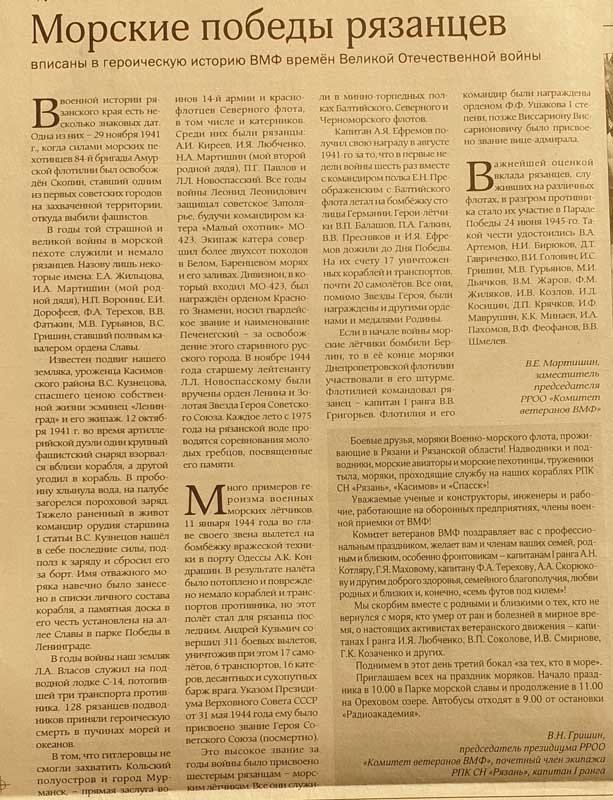 Благодаря большой краеведческой работе, проделанной по разысканию участников исторического парада, областная газета, теперь уже «Рязанские ведомости», в 2011, 2015, 2016 и 2018 годах публиковала репортажи о семнадцати моряках-рязанцах, об участнике боев под Ленинградом и в Заполярье, докторе исторических наук, профессоре Иване Павловиче Попове (1915 – 1996), о фронтовике-подводнике Владимире Федоровиче Феофанове (р. 1916), о полном кавалере ордена Славы, механике-водителе боевого легендарного танка Т-34 Иване Ивановиче Закомолдине (1916 – 1989).