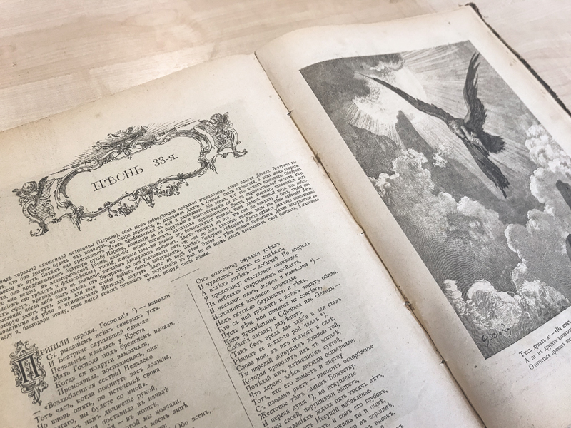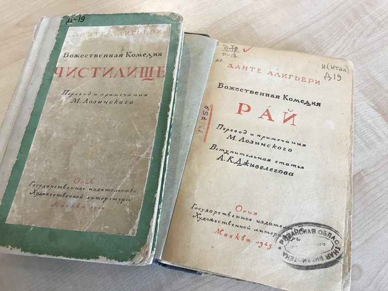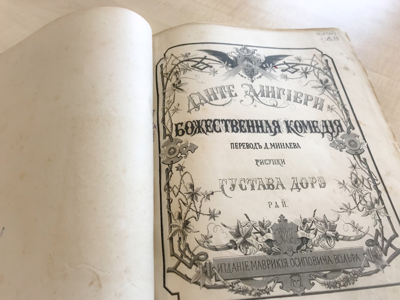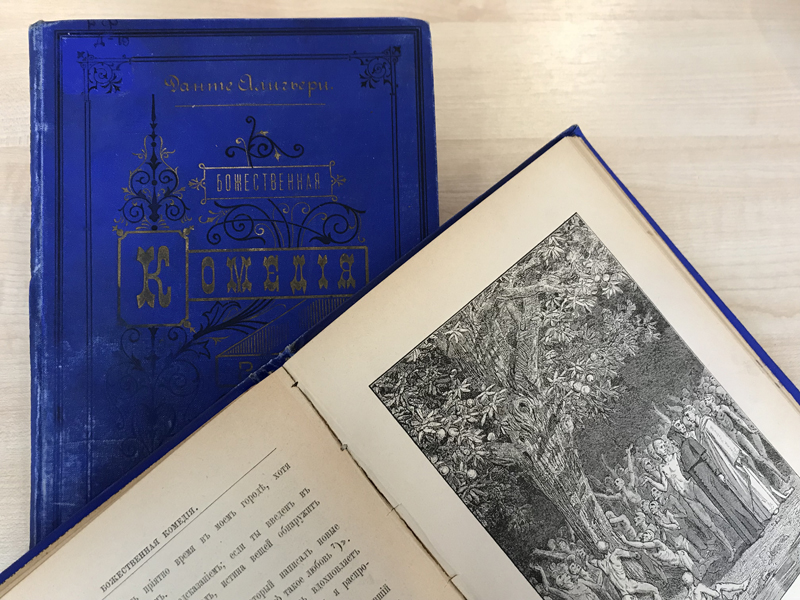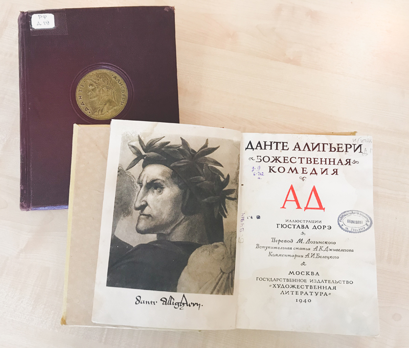 В фондах библиотеки имени Горького хранятся издания произведений великого поэта, выпущенные в XIX–XXI веках на русском и иностранных языках. Читатель может познакомиться с лирическими стихотворениями, сонетами, философскими трактатами поэта. Особого внимания заслуживает издание «Божественной комедии» в переводе Дмитрия Минаева с иллюстрациями выдающегося французского художника Густава Доре, вышедшее в издательстве М.О. Вольфа в 1874–1879 гг.