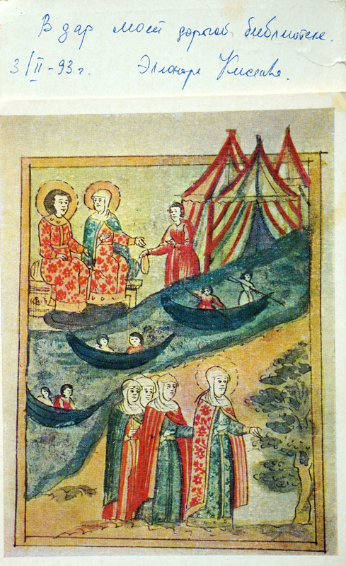 Наша библиотека обладает двумя уникальными документами с дарственными надписями Э.К. Киселевой, они хранятся в «Коллекции автографов» краеведческого депозитария отдела хранения основного фонда. На одном из экземпляров «Коллекции редких и ценных изданий С.А. Есенина из фонда РОУНБ им. Горького» – томике стихов С.А. Есенина, изданном в Бухаресте в 1964 г., в том числе имеется автограф младшей сестры поэта Александры Есениной, являвшейся одним из организаторов создания литературно-мемориального музея в с. Константинове. Другой документ представляет собой иллюстративный материал XVII в. из фонда отдела рукописей Государственного исторического музея, изданный на основе подлинников.