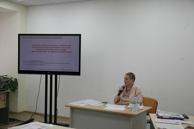 Открыла мероприятие Светлана Александровна Фролова,заведующая отделом формирования фондов РОУНБ имени Горького.Сотрудниками главной библиотеки региона были представлены доклады, которые освещали ключевые вопросы комплектования библиотек. Главный библиотекарь центра формирования информационных ресурсов библиотек области Светлана Викторовна Максимкина раскрыла тему «Профиль комплектования: технология разработки и использования в текущем комплектовании» и подвела итоги акции «“Читающий мир” на библиотечной полке». Главный библиотекарь отдела формирования фондов Елена Михайловна Цикина познакомила присутствующих с законами, ограничивающими доступ к информации. О ресурсах удаленного доступа в помощь муниципальным библиотекам области рассказала Ирина Сергеевна Самощенко, главный библиограф библиографического центра универсального читального зала. Вопросы отчетности и планирования работы отделов комплектования библиотек муниципальных образований Рязанской области осветила Татьяна Борисовна Шевлякова, главный библиотекарь отдела формирования фондов.