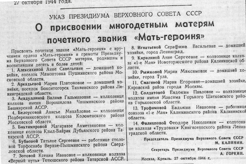 1 ноября исполняется 75 лет со дня вручения первого звания «Мать-героиня». Впервые оно было присвоено 27 октября 1944 года четырнадцати женщинам. Награду вручал в Кремле Михаил Иванович Калинин.