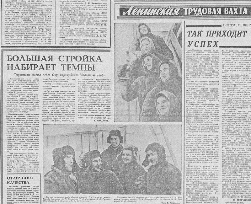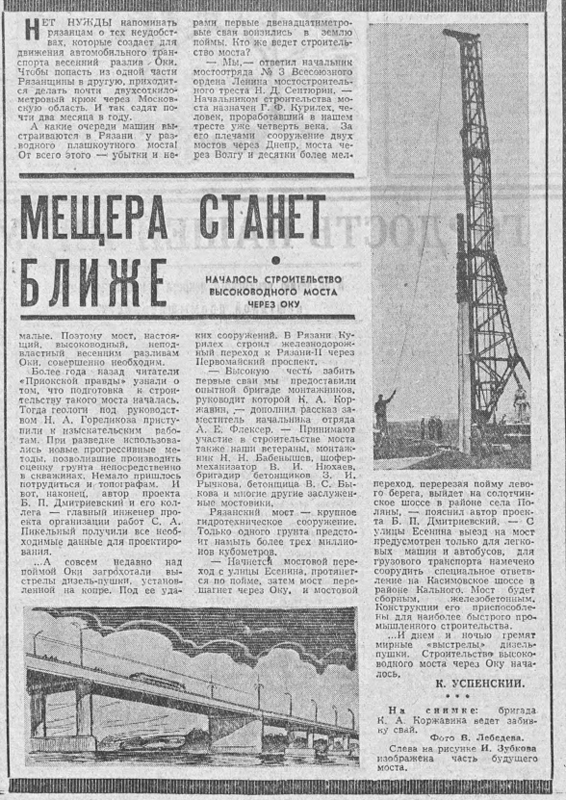 «…Высоководный мост через Оку. Его строительство сейчас уже не отвлеченное понятие. С каждым днем оно развертывается все шире. Рабочие чертежи этого сложного гидротехнического сооружения начинают воплощаться в действительность.