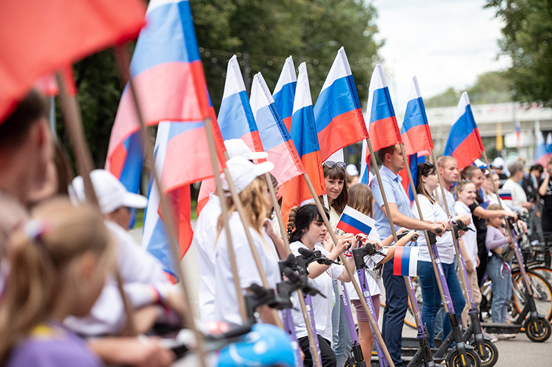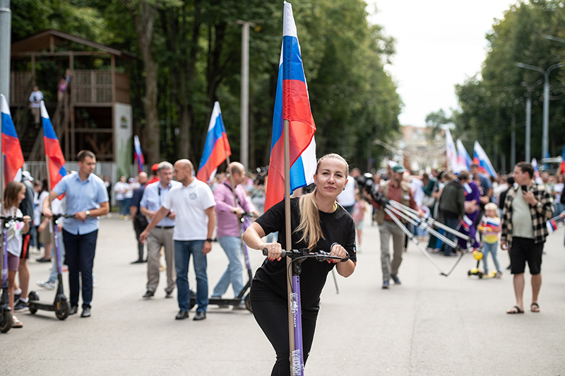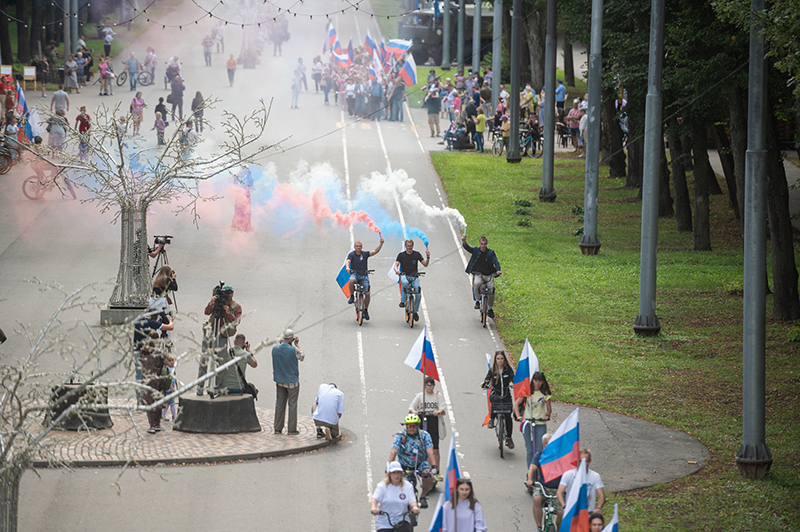 Более 200 велосипедистов и самокатчиков проехали с флагами родной страны по территории Лесопарка от входа до разворотного круга перед пристанью в районе дебаркадера и обратно.