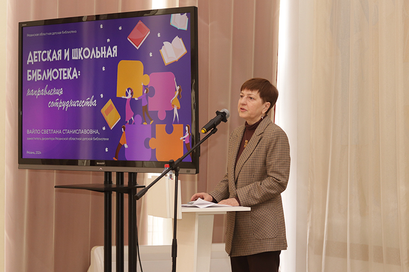Заместитель директора по координации Рязанской областной детской библиотеки Светлана Станиславовна Вайло рассказала об основных направлениях сотрудничества детских и школьных библиотек, об участии библиотек разных ведомств в совместных проектах и акциях: в сетевом региональном проекте «Открой рот», Митяевских литературных чтениях, областном литературном конкурсе «Весенний книжный марафон», межрегиональной акции «Настоящее волшебное путешествие», во всероссийском научно-познавательном проекте «Детский Нобель». Также она уделила внимание сотрудничеству муниципальных детских библиотек Рязанской области со школьными библиотеками.