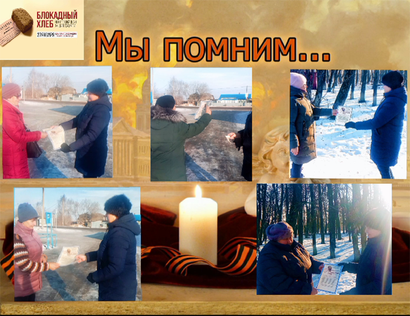 Читатели библиотек Шацкого района стали участниками и слушателями слайд-беседы «Блокада и её герои» (Шацкая детская библиотека), часа памяти «Говорит Ленинград» (Казачинская сельская библиотека), акции «Блокадный хлеб» (Ямбирнская сельская библиотека).