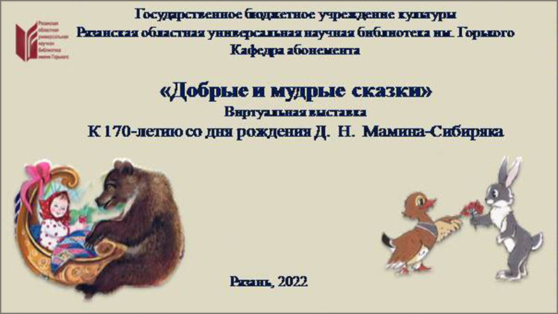 В год 170-летия со дня рождения Дмитрия Наркисовича Мамина-Сибиряка вспоминаем его добрые и мудрые сказки, которые являются прекрасным образцом высокого искусства для детей. Предлагаем нашим юным читателям совершить виртуальное путешествие по книжной выставке. Каждая книга, представленная на выставке, играет роль окна в мир, при помощи которого ребенок познает и его, и себя в этом мире.