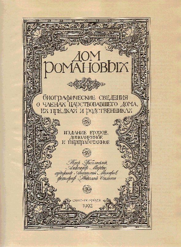 Дом Романовых : биографические сведения о членах царствовавшего дома, их предках и родственниках / [авторы-составители П. Х. Гребельский, А. Б. Мирвис ; оформление А. В. Малафеева ; фотографии Н. А. Сюлюгин]. – Изд. 2-е, доп. и перераб. – Санкт-Петербург : ЛИО «Редактор», 1992. – 279, [1] с. : ил., цв. ил., портр. + приложение (1 л. схем).